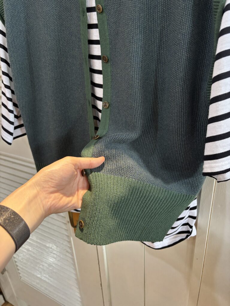 モスグリーン色がデニムパンツにピッタリ!綿パンツやロングスカートにも丁度いい丈感です。