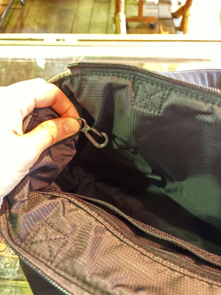 中にもメッシュポケットと鍵などを付けられるフック付き。