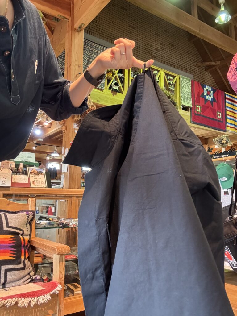 裾部分の布切り替えがあるためブルゾンの様にも見えます。襟の角が取れているようなデザインで、他のシャツとは違う一癖ある部分が魅力。着心地も柔らか。
